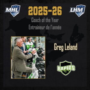 Truro, N.S. (March 20, 2026) – The Maritime Junior Hockey League (MHL) is pleased to announce Greg Leland of the Grand Falls Rapids as the 2025-26 Coach of the Year. Now in his fourth season behind the bench in Grand Falls, Leland guided the team to its first Eastlink North Division title and Metalfab MHL Cup Playoff berth since moving from Woodstock before the 2018-19 season.