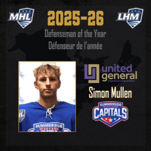 Truro, N.S. (March 21, 2026) – The Maritime Junior Hockey League (MHL) is pleased to announce Simon Mullen of the Summerside Western Capitals as the 2025-26 Defenseman of the Year, presented by United General Insurance Corporation (UGIC), the Official Insurance Partner of the MHL.