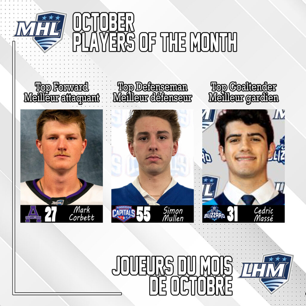 Truro, N.-É. (4 novembre 2025) – La Ligue de hockey junior des Maritimes (LHM) est heureuse de dévoiler les noms des meilleurs attaquant, défenseur et gardien de but du mois d’octobre.