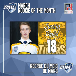 Truro, N.S. (March 24, 2022) – The Maritime Junior Hockey League (MHL) has named Justin David of the Campbellton Tigers as the Pro Design Cresting Rookie of the Month for March. The 17-year-old from Pigeon Hill, N.B. topped all rookies for the month with fifteen points in nine games, which placed him tied for seventh in league scoring in March. David’s ten goals were also tied for the most among all MHL skaters.